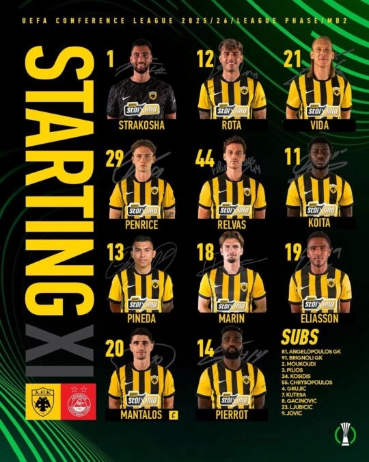 Η ενδεκάδα της ΑΕΚ: Στρακόσα, Ρότα, Ρέλβας, Βίντα, Πενράις, Πινέδα, Μάνταλος, Κοϊτά, Ελίασον, Μαρίν, Πιερό.