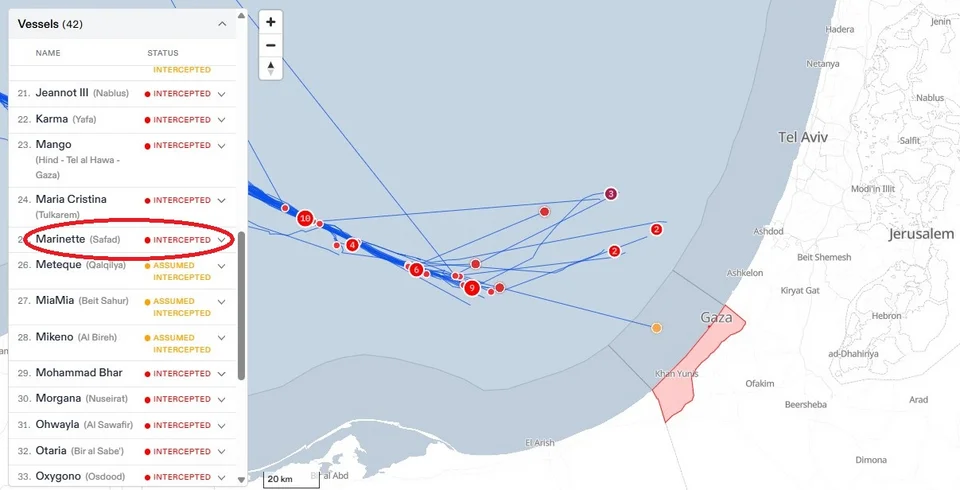 Σύμφωνα με την πλατφόρμα εντοπισμού των σκαφών του στολίσκου «Global Sumud Flotilla», νωρίς το πρωί της Παρασκευής το Marinette είχε κινηθεί βορειοανατολικά, στα ανοιχτά του Ισραήλ, και συνέχιζε την πορεία του.