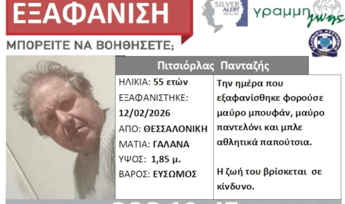 Η οργάνωση Γραμμή Ζωής εξέδωσε ανακοίνωση για την εξαφάνιση του Πανταζή Πιτσιόρλα, 55 ετών, ο οποίος έφυγε από το σπίτι του στο χωριό Δουμπιά Χαλκιδικής στις 12 Φεβρουαρίου 2026 και τελευταία φορά εντοπίστηκε στη Θεσσαλονίκη. Σύμφωνα με την ανακοίνωση, αρχικά μετέβη στο Ζαγκλιβέρι με άγνωστο μέσο και από εκεί με ΚΤΕΛ στην πόλη της Θεσσαλονίκης. Από το βράδυ της 12ης Φεβρουαρίου δεν έχει δώσει σημεία ζωής.