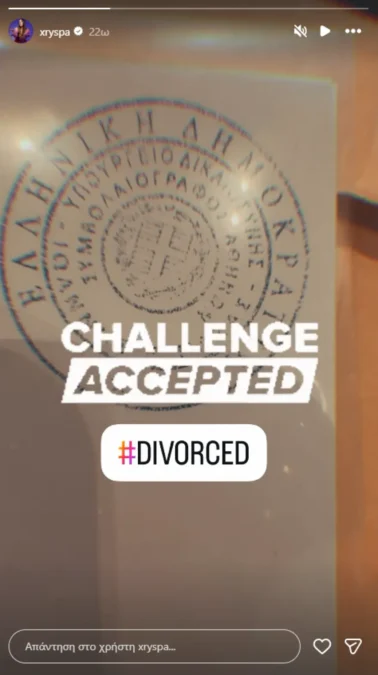 Η Χρύσπα δημοσίευσε στον προσωπικό της λογαριασμό στο Instagram ένα story, όπου φαίνεται η σφραγίδα ενός συμβολαιογράφου. Πάνω στη φωτογραφία έγραψε χαρακτηριστικά: «Αποδέχομαι την πρόκληση. Χωρισμένη».