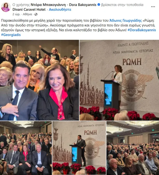 Ο υπουργός Υγείας Άδωνις Γεωργιάδης πραγματοποίησε την επίσημη παρουσίαση του νέου του βιβλίου με τίτλο «Ρώμη: Από την Άνοδο στην Πτώση» σε μια εκδήλωση που διοργανώθηκε στους χώρους του ξενοδοχείου Divani Caravel.