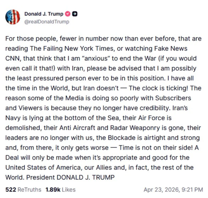 «Για εκείνους, που είναι πλέον λιγότεροι από ποτέ, που διαβάζουν τους αποτυχημένους New York Times ή παρακολουθούν το Fake News CNN, και πιστεύουν ότι «ανυπομονώ» να τερματίσω τον πόλεμο (αν μπορεί κανείς να τον ονομάσει έτσι!) με το Ιράν, σας ενημερώνω ότι είμαι ίσως το λιγότερο πιεσμένο άτομο που έχει βρεθεί ποτέ σε αυτή τη θέση. Έχω όλο τον χρόνο του κόσμου, αλλά το Ιράν δεν έχει — ο χρόνος τρέχει! Ο λόγος για τον οποίο ορισμένα ΜΜΕ έχουν τόσο χαμηλά νούμερα συνδρομητών και τηλεθεατών είναι επειδή δεν έχουν πλέον αξιοπιστία. Το Πολεμικό Ναυτικό του Ιράν βρίσκεται στον βυθό της θάλασσας, η Πολεμική Αεροπορία του έχει καταστραφεί, τα αντιαεροπορικά και ραντάρ όπλα του έχουν εξαφανιστεί, οι ηγέτες του δεν είναι πλέον μαζί μας, ο αποκλεισμός είναι αδιαπέραστος και ισχυρός και, από εκεί και πέρα, τα πράγματα μόνο χειροτερεύουν — ο χρόνος δεν είναι με το μέρος τους! Μια συμφωνία θα επιτευχθεί μόνο όταν είναι κατάλληλη και ωφέλιμη για τις Ηνωμένες Πολιτείες της Αμερικής, τους συμμάχους μας και, στην πραγματικότητα, τον υπόλοιπο κόσμο. Πρόεδρος ΝΤΟΝΑΛΝΤ ΤΡΑΜΠ»