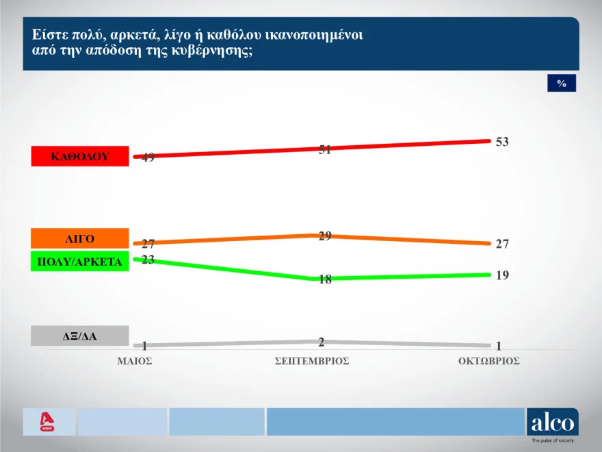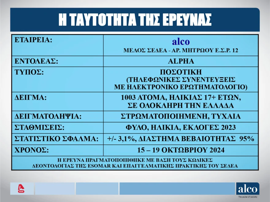 Η μέτρηση της ALCO «δείχνει» μία οκτακομματική Βουλή, με αρκετά κόμματα λίγο κάτω ή λίγο πάνω από το όριο του 3%. Οι προσδοκίες της ελληνικής κοινωνίας εξακολουθούν να είναι μειωμένες – χαρακτηριστικά το 44% εκτιμά ότι τα πράγματα θα πάνε χειρότερα για τους ίδιους και τις οικογένειές τους, έναντι μόνον 9% που πιστεύουν ότι θα πάνε καλύτερα, ενώ το 53% δηλώνουν ότι δεν είναι καθόλου ικανοποιημένοι από την απόδοση της κυβέρνησης.