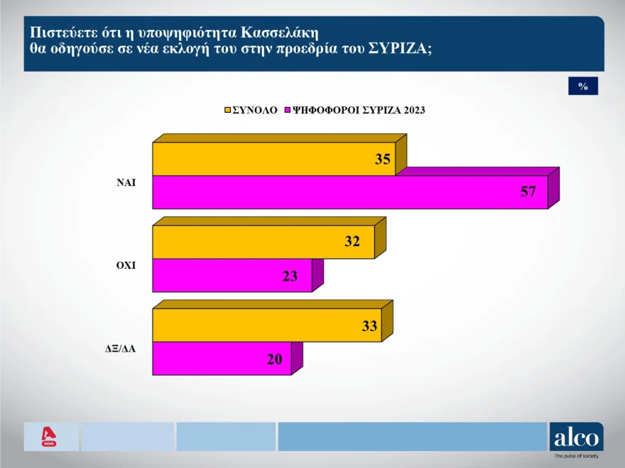 Ενισχυμένο από την διαδικασία εκλογής ηγεσίας βγήκε το ΠΑΣΟΚ, για το οποίο έχει πλέον θετική εικόνα το 41% του εκλογικού σήματος – ενώ ο ΣΥΡΙΖΑ καταρρέει στο 6,5% στην πρόθεση ψήφου επί των εγκύρων. Μάλιστα, οι ψηφοφόροι του ΣΥΡΙΖΑ σε ποσοστό 57% εκτιμούν ότι τυχόν υποψηφιότητά του Στέφανου Κασσελάκη θα οδηγούσε σε επανεκλογή του – πράγμα που δείχνει το μέγεθος του αδιεξόδου στο κόμμα.