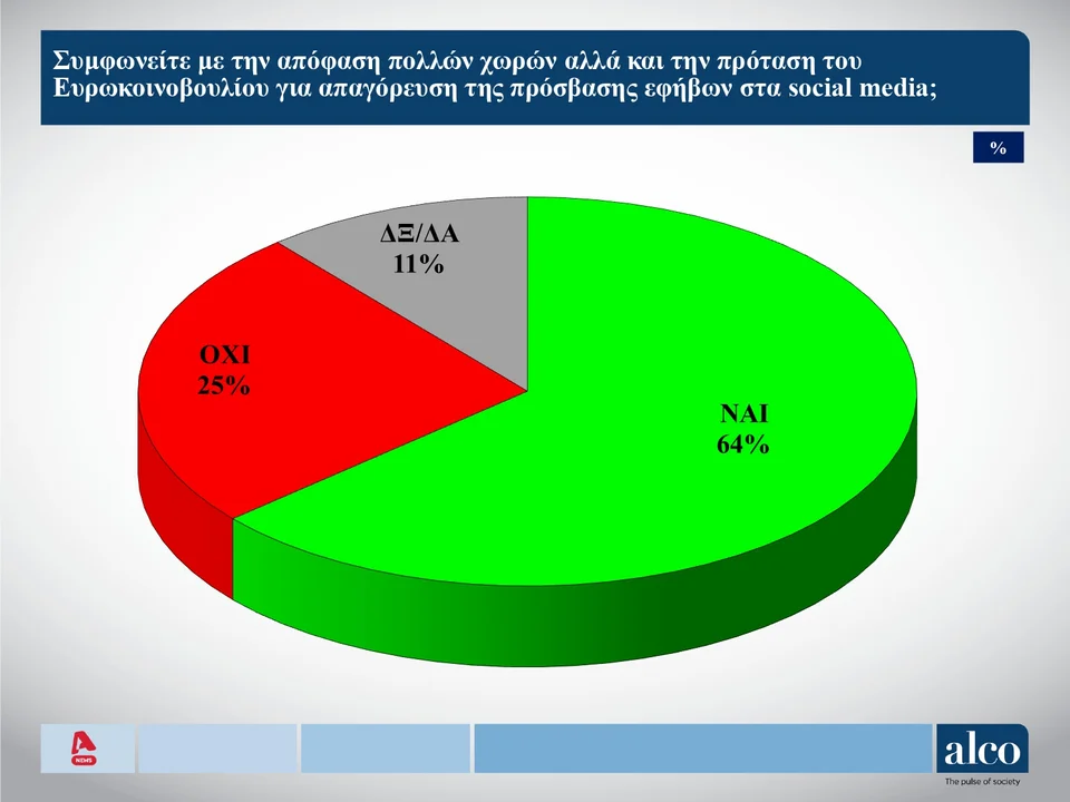 Ένα από τα ζητήματα που απασχολούν έντονα την ελληνική οικογένεια είναι η επιρροή που έχουν τα σόσιαλ μίντια στα παιδιά τους. Χαρακτηριστικό είναι πως το 64% των ερωτηθέντων στη δημοσκόπηση συμφώνησε με την πρόταση για απαγόρευση της πρόσβασης εφήβων, ενώ μόνο το 25% διαφωνεί.