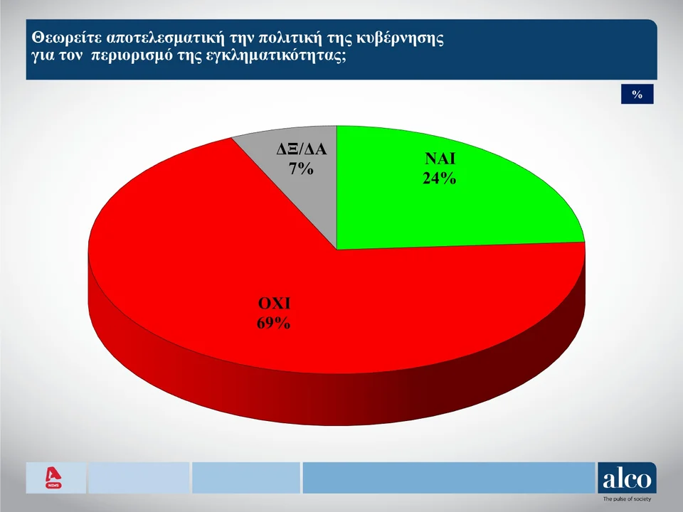 Αντίθετα, στο ζήτημα της εγκληματικότητας, οι πολίτες βλέπουν πως η πολιτική της κυβέρνησης δεν αποδίδει καρπούς και μάλιστα σε ποσοστό 69%.