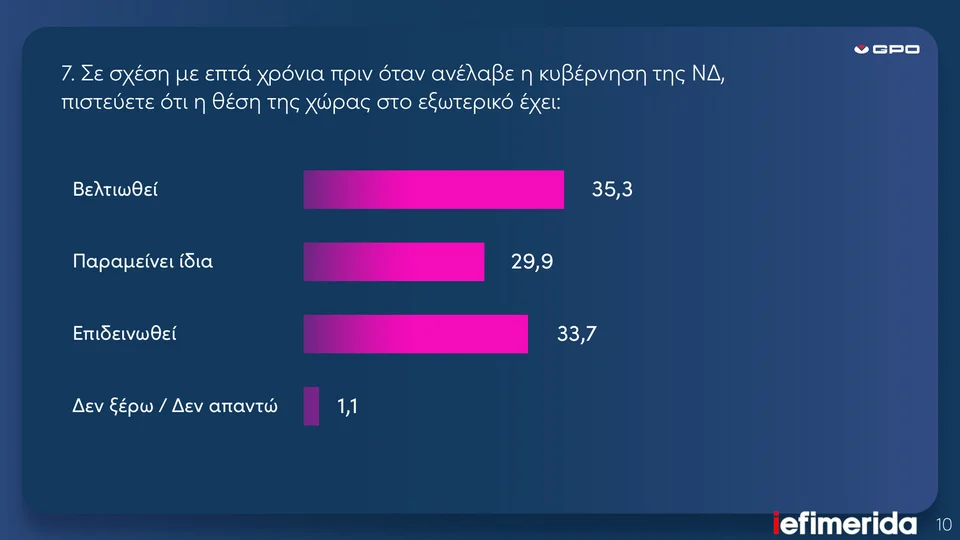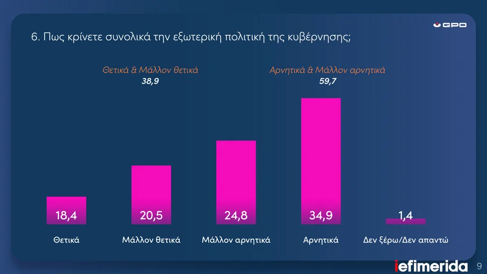 Η κυβέρνηση αποτιμάται θετικά για την εξωτερική πολιτική από το 38,9% των πολιτών, με τον πρωθυπουργό να θεωρείται καλύτερος εκπρόσωπος της χώρας στο εξωτερικό από το 31,2%.
