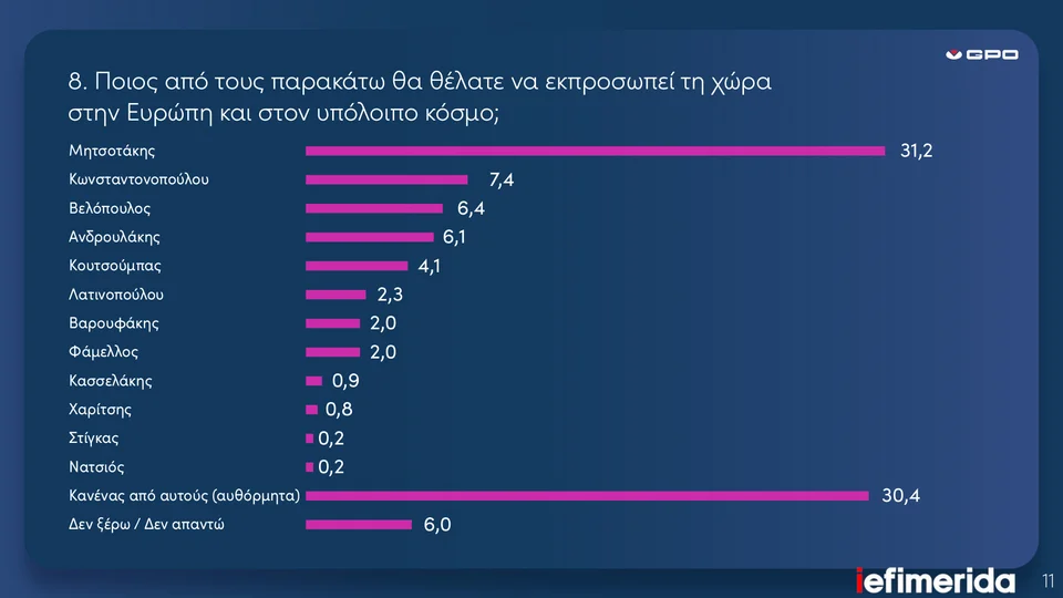 Η GPO σε συνεργασία με το iefimerida παρουσίασε την πρώτη πολιτική δημοσκόπηση για τον Φεβρουάριο του 2026, εστιάζοντας στις διεργασίες που διαμορφώνουν την εκλογική συμπεριφορά των πολιτών εν όψει των εθνικών εκλογών της άνοιξης 2027. Η έρευνα περιέλαβε θέματα της επικαιρότητας, όπως η συνάντηση του Έλληνα πρωθυπουργού με τον Τούρκο Πρόεδρο Recep Tayyip Erdoğan και η πρόταση για Συνταγματική Αναθεώρηση, καθώς και την αξιολόγηση των πολιτικών δυνάμεων.