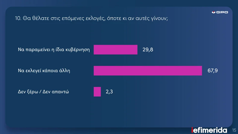 Μόλις το 29,8% θα ήθελε την κυβέρνηση να συνεχίσει, ενώ το 67,9% επιθυμεί αλλαγή – αν και η αντιπολίτευση εμφανίζεται κατακερματισμένη και χωρίς σαφή προοπτική. Συνεργασία της κεντροαριστεράς θα μπορούσε να αλλάξει τους συσχετισμούς για το 42,1%, αλλά η πλειοψηφία (54,1%) αμφισβητεί τη δυνατότητα ανατροπής.