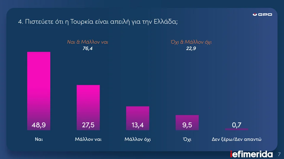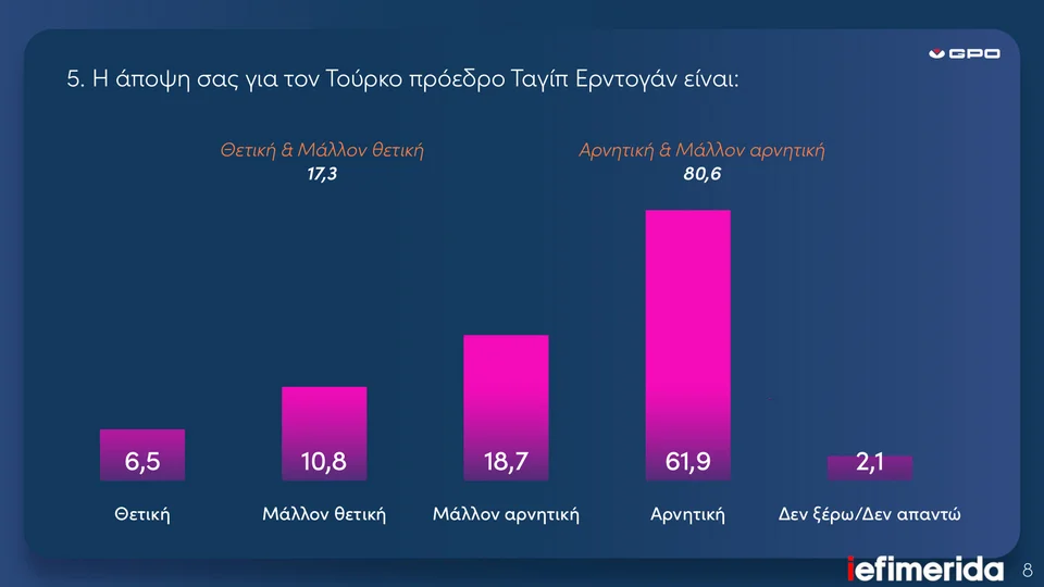 Το 43,9% των πολιτών αξιολόγησε θετικά τη συνάντηση, ενώ το 49,2% την έκρινε αρνητική. Παρά το γεγονός ότι δεν προέκυψαν νέα αποτελέσματα, το 50,7% θεωρεί απαραίτητες τις διπλωματικές επαφές, ενώ το 57,6% ζητά πιο διεκδικητική στάση της Ελλάδας απέναντι στην Τουρκία, η οποία για το 76,4% θεωρείται απειλητική. Η δημοφιλία του Ερντογάν παραμένει χαμηλή στο 17,3%.