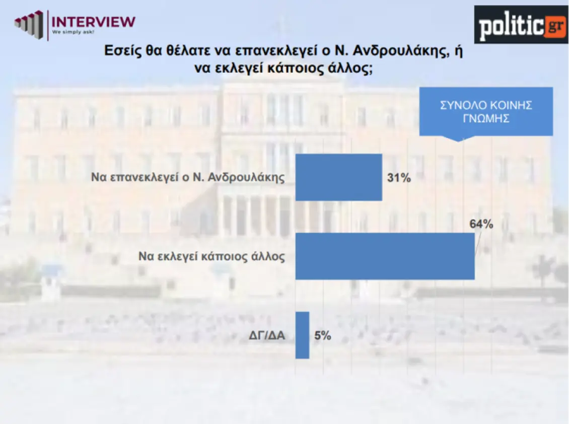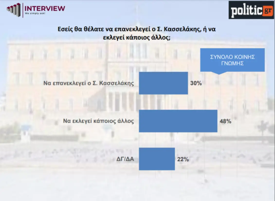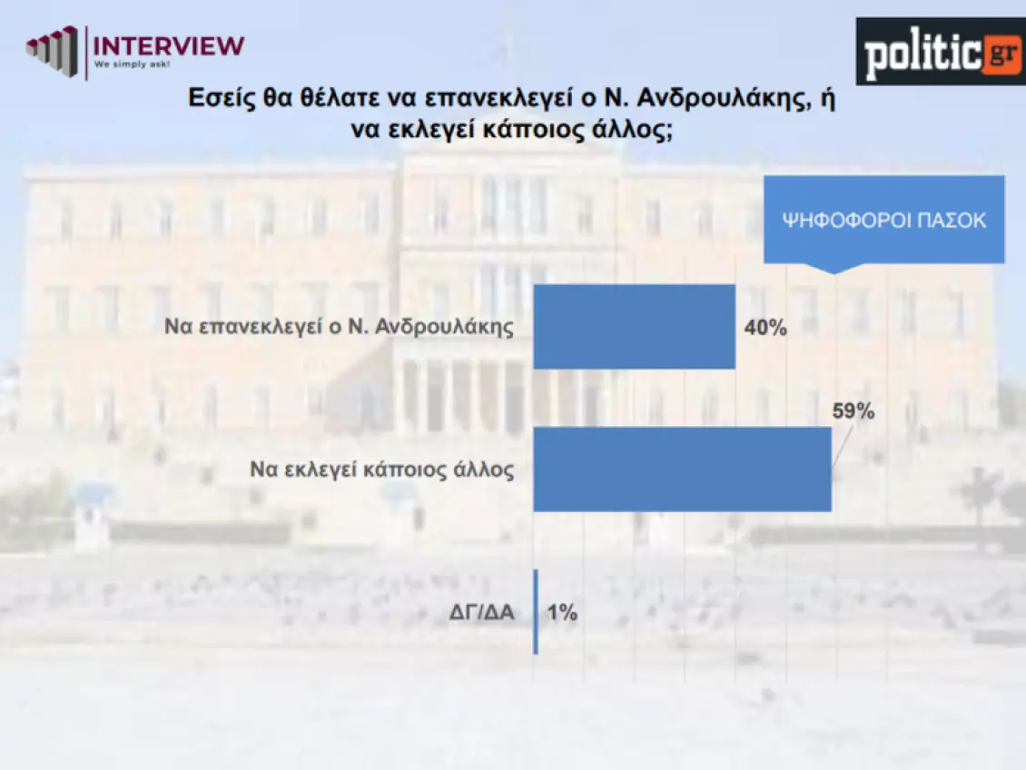 Στην ερώτηση «αν θέλετε να επανεκλεγεί ο Στ. Κασσελάκης», στο σύνολο της κοινής γνώμης οι περισσότεροι απαντούν αρνητικά (48%). Ισοψηφία έχουμε στους ψηφοφόρους του ΣΥΡΙΖΑ καθώς το 42% επιθυμεί την επανεκλογή του και το αντίστοιχο ποσοστό την απομάκρυνσή του. Στο μέτωπο του ΠΑΣΟΚ, τόσο η κοινή γνώμη όσο και οι ψηφοφόροι του ΠΑΣΟΚ θέλουν νέο πρόσωπο για πρόεδρο στο κόμμα. Ειδικότερα, στο σύνολο της κοινής γνώμης το 31% θέλει ξανά πρόεδρο τον Νίκο Ανδρουλάκη, σε αντίθεση με το 64% που θα ήθελε να εκλεγεί κάποιος άλλος για πρόεδρος. Ομοίως και με τους ψηφοφόρους του ΠΑΣΟΚ, οι περισσότεροι (59%) επιθυμούν να εκλεγεί νέο πρόσωπο για πρόεδρος στο κόμμα.