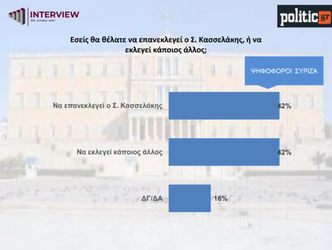 Προβάδιμα του Στέφανου Κασσελάκη, ενόψει των εκλογών στον ΣΥΡΙΖΑ και απόλυτη ισοψηφία μεταξύ του Νίκου Ανδρουλάκη και του Χάρη Δούκα δείχνει η νέα δημοσκόπηση της Interview για λογαριασμό της POLITIC.