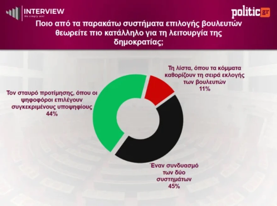 Όσον αφορά τη συζήτηση για τις αλλαγές στον εκλογικό νόμο, στη δημοσκόπηση αποτυπώνεται ότι το 45% προτιμά συνδυασμό σταυρού και λίστας, το 44% επιλέγει σταυρό προτίμησης και μόνο το 11% επιλέγει καθαρή λίστα.