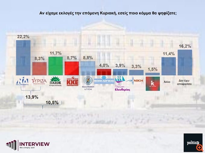 Πρώτο κόμμα στις προτιμήσεις των ψηφοφόρων παραμένει η Νέα Δημοκρατία συγκεντρώνοντας το 22,2%, με το ποσοστό της όμως να καταγράφει σημαντική πτώση σε σχέση με τον Δεκέμβριο του 2023, σύμφωνα με τη νέα δημοσκόπηση που πραγματοποίησε η Interview για λογαριασμό της Politic.gr, όπου παρατηρείται μια σημαντική ανατροπή στο πολιτικό σκηνικό της χώρας όσον αφορά την πρόθεση ψήφου.