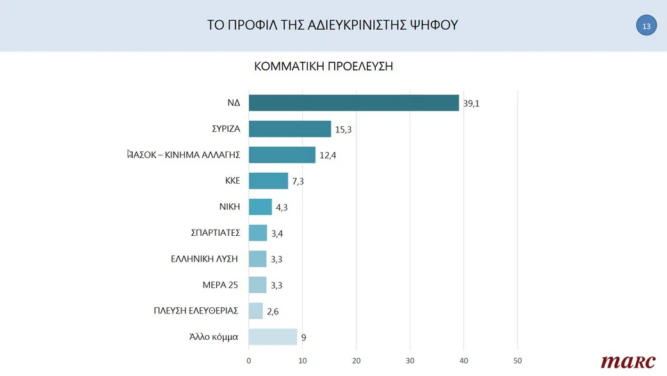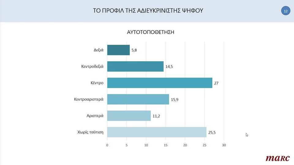 Ξεχωριστό ενδιαφέρον παρουσιάζουν επίσης τα ευρήματα της δημοσκόπησης της Marc, ως προς το προφίλ της αδιευκρίνιστης ψήφου. Σχεδόν ένας στους 4 (39,1%) προέρχεται από την δεξαμενή της ΝΔ, το 27% δηλώνει κεντρώο και η πλειονότητά του είναι ηλικιακά στην κατηγορία 45-54 ετών.