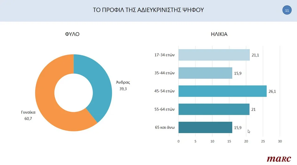 Η ακτινογραφία του προφίλ της αδιευκρίνιστης ψήφου επιχειρείται από την έρευνα της Marc. Σύμφωνα με τα αποτελέσματα, το 26,1% είναι ηλικιακά στην κατηγορία 45-54 ετών, το 21,1% από 17-34, το 21% από 55-64 ετών. Πιο «αποφασισμένοι» στο τι θα ψηφίσουν είναι οι ηλικές 35-44 και 65 και άνω.