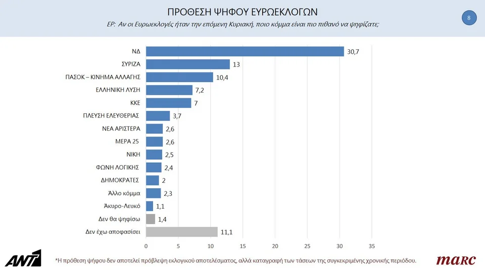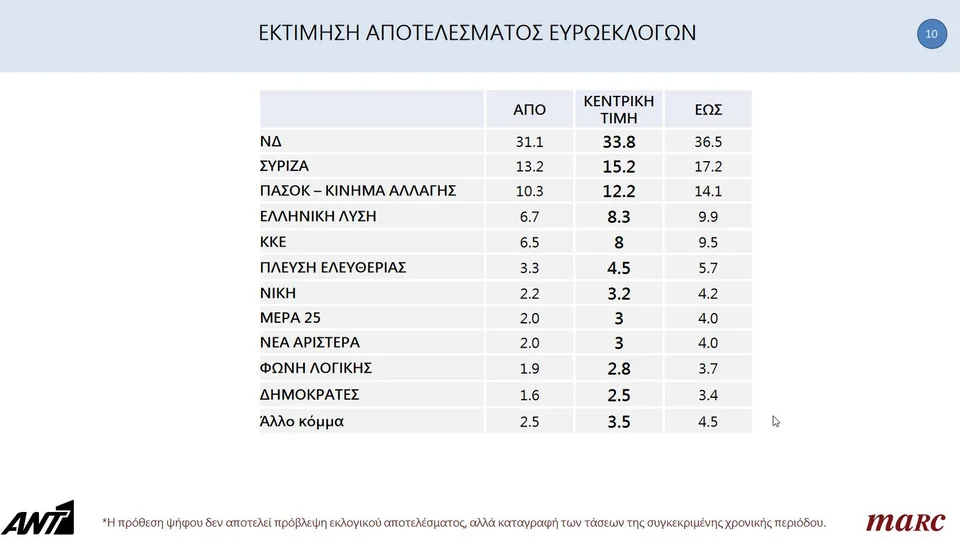 Στην εκτίμηση του αποτελέσματος των ευρωεκλογών η Marc δείχνει τα εξής: