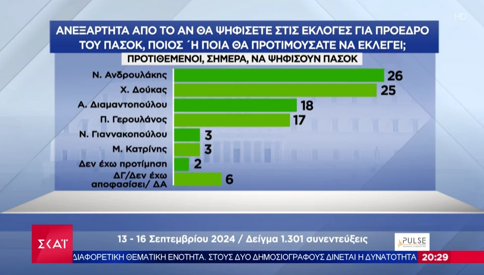 Τέλος, σε όσους σίγουρα ή μάλλον προτίθενται να πάνε να ψηφίσουν για πρόεδρο του ΠΑΣΟΚ, ο Ν. Ανδρουλάκης είναι πρώτος με 27% ενώ στι δεύτερη θέση ισοβαθμούν με 22% Δούκας και Διαμαντοπούλου. Στο16% ο Π. Γερουλάνος, στο 4% ο Μιχάλης Κατρίνης και στο 3% η Ν. Γιαννακοπούλου.