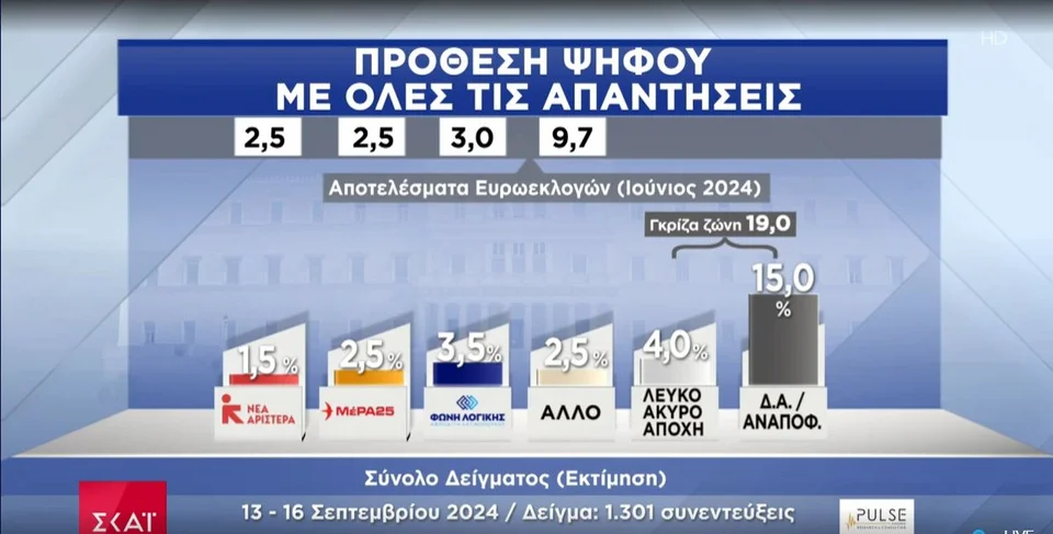 Στην εκτίμηση αποτελέσματος, με σενάριο κατανομής αναποφάσιστων, η Pulse δίνει 30% στη ΝΔ (1,5 μονάδα πάνω από το ποσοστό των ευρωεκλογών). Δεύτερο το ΠΑΣΟΚ που εκτοξεύεται στο 16%, τρίτος ο ΣΥΡΙΖΑ με 12,5%. Ακολουθεί το ΚΚΕ με 9,5%, η Λύση με 9%, η Πλεύση με 5%, η Νίκη με 4,5%, όσο και η Φωνή Λογικής.