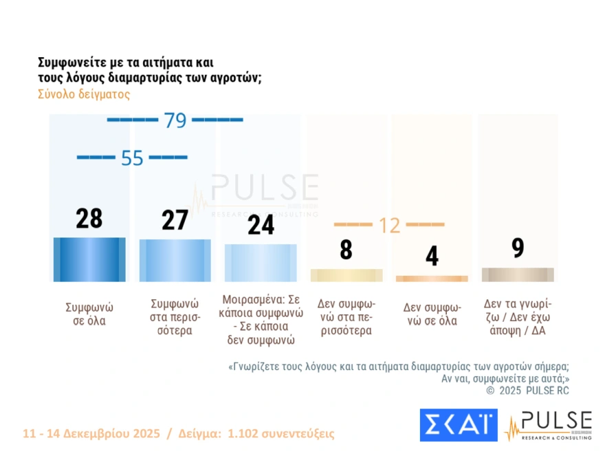 Σχετικά με τις διαμαρτυρίες των αγροτών, το 79% δηλώνει ΄΄οτι συμφωνεί με κ΄΄αποια ή όλα τα αιτήματα των αγροτών, ενώ οι απόψεις για τους αποκλεισμούς δρόμων είναι μοιρασμένες, με το 48% να συμφωνεί και το 45% να διαφωνεί. Σχετικά με την κομματική ταυτότητα εκείνων που δηλώνουν ότι συμφωνούν, οι περισσότεροι δηλώνουν ότι στηρίζουν ΣΥΡΙΖΑ, και ακολουθούν οι ψηφοφόροι της Πλεύσης Ελευθερίας και του ΚΚΕ.