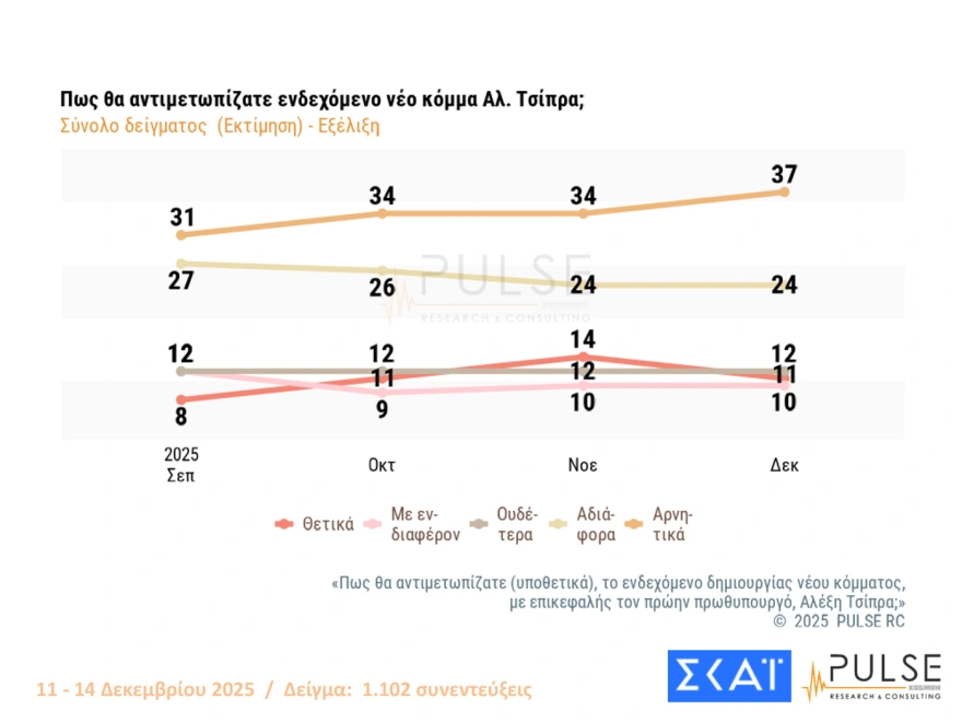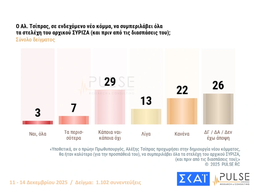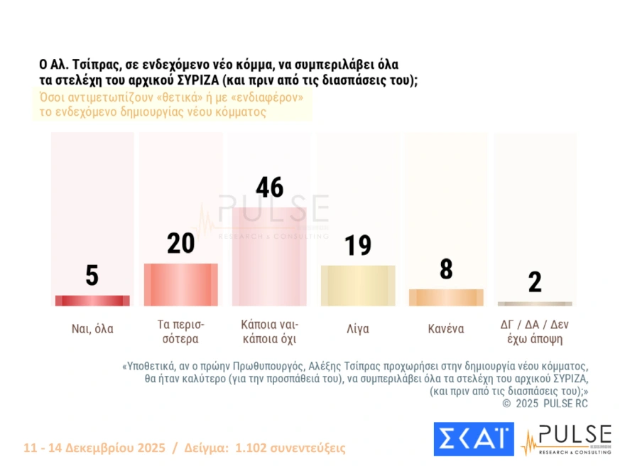 Ενδιαφέρον παρουσιάζει το γεγονός ότι εκείνοι που δηλώνουν «θετικοί» σε ένα «κόμμα Τσίπρα» μειώθηκαν από το 14% τον Νοέμβριο στο 11%, ενώ και εκείνοι που δηλώνουν «ενδιαφέρον» για μία τέτοια εξέλιξη, παρέμειναν σταθεροί στο 10%, δίνοντας μία «περίμετρο» 21% για το επικείμενο εγχείρημα. Πάντως, η συγκεκριμένη ομάδα ζητά σε ποσοστό 46% από τον πρώην πρωθυπουργό να είναι επιλεκτικός με το ποιους θα πάρει από τον ΣΥΡΙΖΑ.