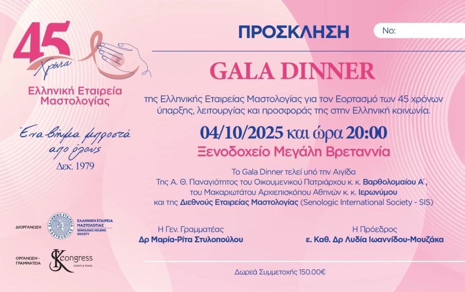Με ιδιαίτερη χαρά και υπερηφάνεια, η Ελληνική Εταιρεία Μαστολογίας (ΕΕΜ) ανακοινώνει τη διοργάνωση της επετειακής εκδήλωσης Gala Dinner, το Σάββατο 4 Οκτωβρίου 2025, στο εμβληματικό ξενοδοχείο Μεγάλη Βρετανία στο Σύνταγμα, με αφορμή τη συμπλήρωση 45 χρόνων αδιάλειπτης επιστημονικής και κοινωνικής προσφοράς στον τομέα της Μαστολογίας.