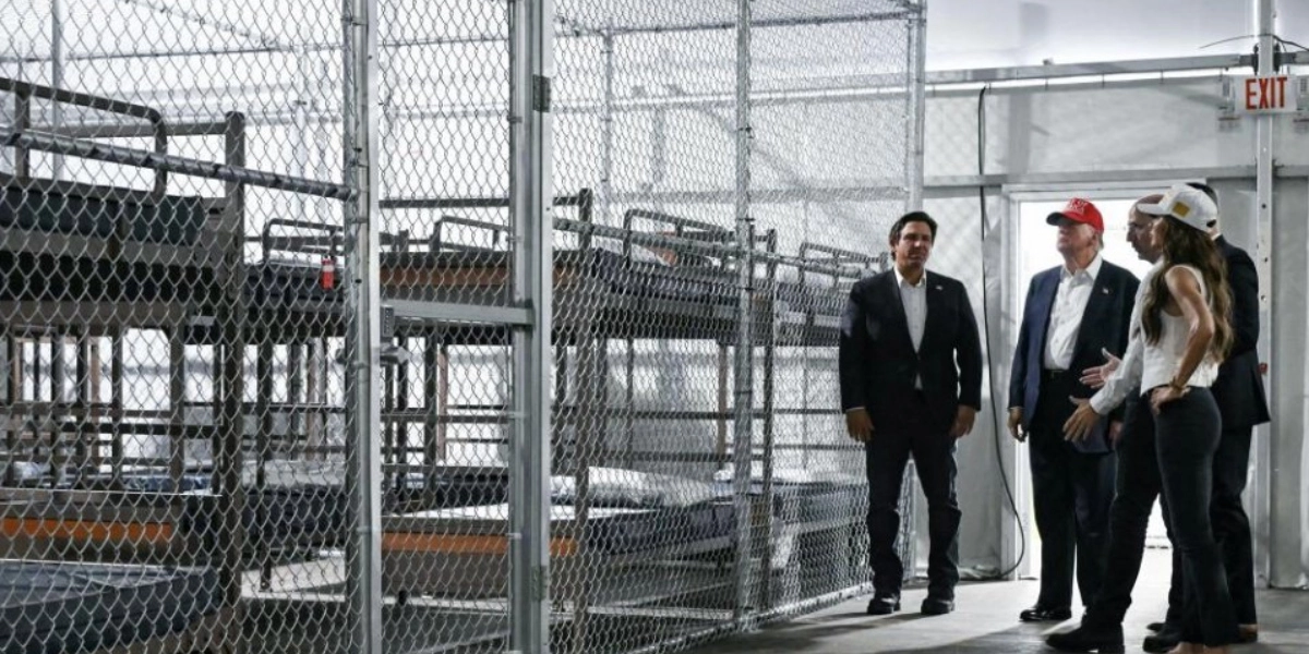 Το κέντρο κράτησης αυτό στήθηκε βιαστικά τον Ιούνιο, σε εγκαταλελειμμένο αεροδρόμιο μέσα στα έλη Έβεργκλεϊντς. Τοπικοί αξιωματούχοι κι ο Λευκός Οίκος το βάφτισαν «Αλκατράζ με αλιγάτορες», παραπέμποντας στη διαβόητη φυλακή στον κόλπο του Σαν Φρανσίσκο που ο πρόεδρος Τραμπ θέλει εξάλλου να ξανανοίξει. Στο κέντρο κράτησης στη Φλόριντα προβλεπόταν να υπάρχουν 3.000 θέσεις, με βάση δηλώσεις της υπουργού Εσωτερικής Ασφαλείας Κρίστι Νόεμ.