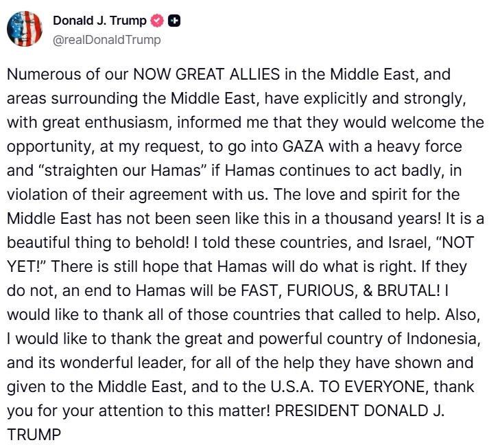 Συγκεκριμένα ο Αμερικανός πρόεδρος έγραψε: «Πολλοί από τους ΤΩΡΑ ΜΕΓΑΛΟΥΣ ΣΥΜΜΑΧΟΥΣ μας στη Μέση Ανατολή — και στις περιοχές γύρω από αυτήν — μου έχουν εκφράσει ρητά, με μεγάλη ένταση και ενθουσιασμό, ότι θα αποδέχονταν με χαρά την ευκαιρία, αν το ζητούσα, να εισέλθουν στη ΓΑΖΑ με ισχυρή στρατιωτική δύναμη και να “συνετίσουν τη Χαμάς”, εάν η οργάνωση συνεχίσει να συμπεριφέρεται άσχημα, παραβιάζοντας τη συμφωνία της μαζί μας».