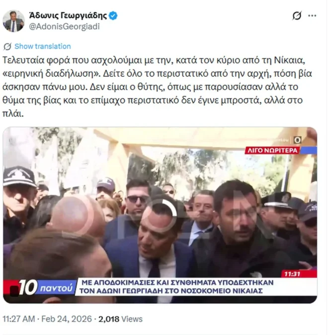 Στα επεισόδια που σημειώθηκαν στο Γενικό Κρατικό Νίκαιας κατά την επίσκεψή του την περασμένη εβδομάδα αναφέρθηκε ο υπουργός Υγείας, Άδωνις Γεωργιάδης. «Δεν είμαι ο θύτης, όπως με παρουσίασαν, αλλά το θύμα της βίας και το επίμαχο περιστατικό δεν έγινε μπροστά, αλλά στο πλάι», έγραψε στο Χ, δίνοντας στη δημοσιότητα το βίντεο από όσα συνέβησαν στο νοσοκομείο.
