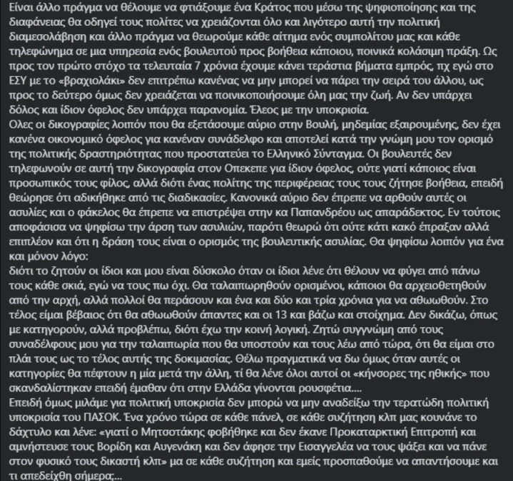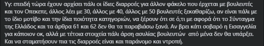 Υγ: επειδή τώρα έχουν αρχίσει πάλι οι ίδιες διαρροές για άλλον φάκελο που έρχεται με βουλευτές και τον Οπεκεπε, άλλος λέει με 30, άλλος με 40, άλλος με 50 βουλευτές ξεκαθαρίζω, αν είναι πάλι με το ίδιο μοτίβο και την ίδια ποιότητα κατηγοριών, να ξέρουν ότι σε ό,τι με αφορά ότι το Σύνταγμα της Ελλάδος και τα άρθρα 61 και 62 δεν θα τα παραβιάσω ξανά. Αν βρει κάτι σοβαρό η Εισαγγελία για κάποιον οκ, αλλά με τέτοια στοιχεία πάλι άρση ασυλίας βουλευτών από μένα δεν θα υπάρξει. Και να σταματήσουν πια τις διαρροές είναι και παράνομο και ντροπή».