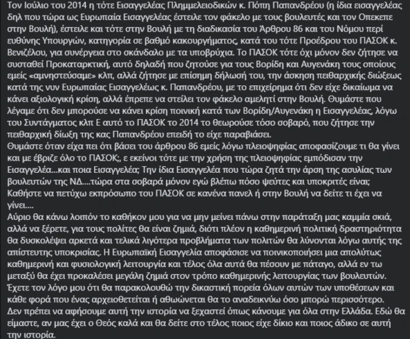 Τον Ιούλιο του 2014 η τότε Εισαγγελέας Πλημμελειοδικών κ. Πόπη Παπανδρέου (η ίδια εισαγγελέας δηλ που τώρα ως Ευρωπαία Εισαγγελέας έστειλε τον φάκελο με τους βουλευτές και τον Οπεκεπε στην Βουλή), έστειλε και τότε στην Βουλή με τη διαδικασία του Άρθρου 86 και του Νόμου περί ευθύνης Υπουργών, κατηγορία σε βαθμό κακουργήματος, κατά του τότε Προέδρου του ΠΑΣΟΚ κ. Βενιζέλου, για συνέργεια στο σκάνδαλο με τα υποβρύχια. Το ΠΑΣΟΚ τότε όχι μόνον δεν ζήτησε να συσταθεί Προκαταρκτική, αυτό δηλαδή που ζητούσε για τους Βορίδη και Αυγενάκη τους οποίους εμείς «αμνηστεύσαμε» κλπ, αλλά ζήτησε με επίσημη δήλωσή του, την άσκηση πειθαρχικής διώξεως κατά της νυν Ευρωπαίας Εισαγγελέως κ. Παπανδρέου, με το επιχείρημα ότι δεν είχε δικαίωμα να κάνει αξιολογική κρίση, αλλά έπρεπε να στείλει τον φάκελο αμελητί στην Βουλή. Θυμάστε που λέγαμε ότι δεν μπορούσε να κάνει κρίση ποινική κατά των Βορίδη/Αυγενάκη η Εισαγγελέας, λόγω του Συντάγματος κλπ Ε αυτό το ΠΑΣΟΚ το 2014 το θεωρούσε τόσο σοβαρό, που ζήτησε την πειθαρχική δίωξη της κας Παπανδρέου επειδή το είχε παραβιάσει.