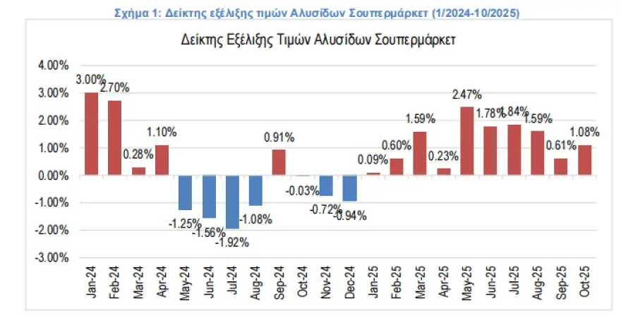 Τον Οκτώβριο του 2025 ο πληθωρισμός στα σούπερ μάρκετ διαμορφώθηκε στο 1,08%, σύμφωνα με έρευνα του Ινστιτούτου Έρευνας Λιανεμπορίου Καταναλωτικών Αγαθών (ΙΕΛΚΑ). Πρόκειται για χαμηλότερο επίπεδο σε σχέση με την περίοδο Μαΐου-Αυγούστου 2025, ενώ το συνολικό κυλιόμενο 12μηνο (Νοέμβριος 2024 – Οκτώβριος 2025) καταγράφει αύξηση +0,85%.
