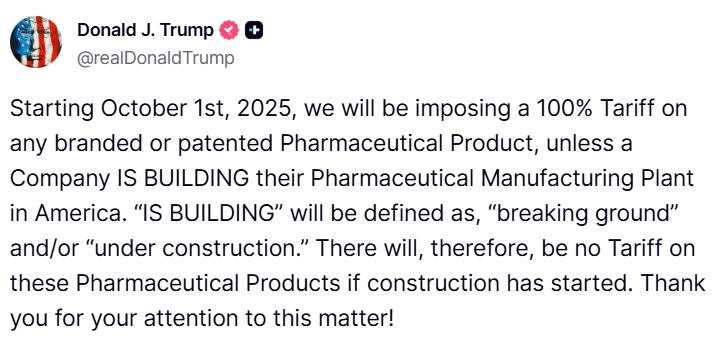 «Από την 1η Οκτωβρίου 2025, θα επιβάλλουμε δασμό 100% σε οποιοδήποτε επώνυμο ή κατοχυρωμένο με δίπλωμα ευρεσιτεχνίας φαρμακευτικό προϊόν, εκτός εάν μια εταιρεία ΚΑΤΑΣΚΕΥΑΖΕΙ το εργοστάσιο παραγωγής φαρμακευτικών προϊόντων της στην Αμερική. Ο όρος «ΚΑΤΑΣΚΕΥΑΖΕΙ» θα ορίζεται ως «έναρξη εργασιών» ή/και «υπό κατασκευή». Συνεπώς, δεν θα υπάρχει δασμός σε αυτά τα φαρμακευτικά προϊόντα εάν έχει ξεκινήσει η κατασκευή. Σας ευχαριστούμε για την προσοχή σας σε αυτό το θέμα!».