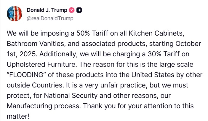 «Θα επιβάλουμε δασμό 50% σε όλα τα ντουλάπια κουζίνας, τα μπάνια και τα σχετικά προϊόντα, από την 1η Οκτωβρίου 2025. Επιπλέον, θα χρεώνουμε δασμό 30% στα ταπετσαρισμένα έπιπλα. Ο λόγος για αυτό είναι η μεγάλης κλίμακας «ΠΛΗΜΜΥΡΑ» αυτών των προϊόντων στις Ηνωμένες Πολιτείες από άλλες εξωτερικές χώρες. Είναι μια πολύ άδικη πρακτική, αλλά πρέπει να προστατεύσουμε, για λόγους εθνικής ασφάλειας και για άλλους λόγους, τη διαδικασία παραγωγής μας. Σας ευχαριστούμε για την προσοχή σας σε αυτό το θέμα!».