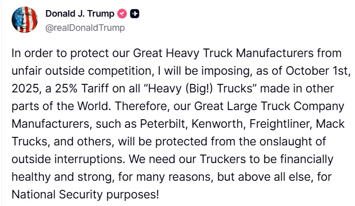 «Προκειμένου να προστατεύσω τους μεγάλους κατασκευαστές βαρέων φορτηγών μας από τον αθέμιτο εξωτερικό ανταγωνισμό, θα επιβάλω, από την 1η Οκτωβρίου 2025, δασμό 25% σε όλα τα «Βαρέα (Μεγάλα!) Φορτηγά» που κατασκευάζονται σε άλλα μέρη του κόσμου. Επομένως, οι μεγάλοι κατασκευαστές μεγάλων εταιρειών φορτηγών μας, όπως οι Peterbilt, Kenworth, Freightliner, Mack Trucks και άλλες, θα προστατεύονται από την επίθεση εξωτερικών διακοπών. Χρειαζόμαστε οι οδηγοί φορτηγών μας να είναι οικονομικά υγιείς και ισχυροί, για πολλούς λόγους, αλλά πάνω απ’ όλα, για σκοπούς Εθνικής Ασφάλειας!».