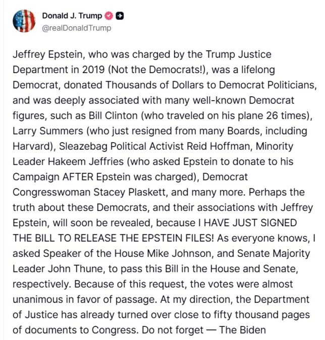 «Μόλις υπέγραψα τον νόμο για τη δημοσιοποίηση του φακέλου Έπστιν!», ανέφερε, με όλη την πρόταση γραμμένη με κεφαλαία γράμματα, ο ρεπουμπλικάνος πρόεδρος σε ανάρτηση του, σχεδόν τετρακοσίων λέξεων, με την οποία κατηγόρησε δημοκρατικούς πως προσπαθούν να κρύψουν την «αλήθεια» για τον εκατομμυριούχο χρηματομεσίτη και σύμβουλο επενδύσεων που πέθανε σε φυλακή της Νέας Υόρκης το 2019, προτού δικαστεί για σειρά κακουργημάτων σεξουαλικής φύσης με θύματα ιδίως ανήλικα κορίτσια.
