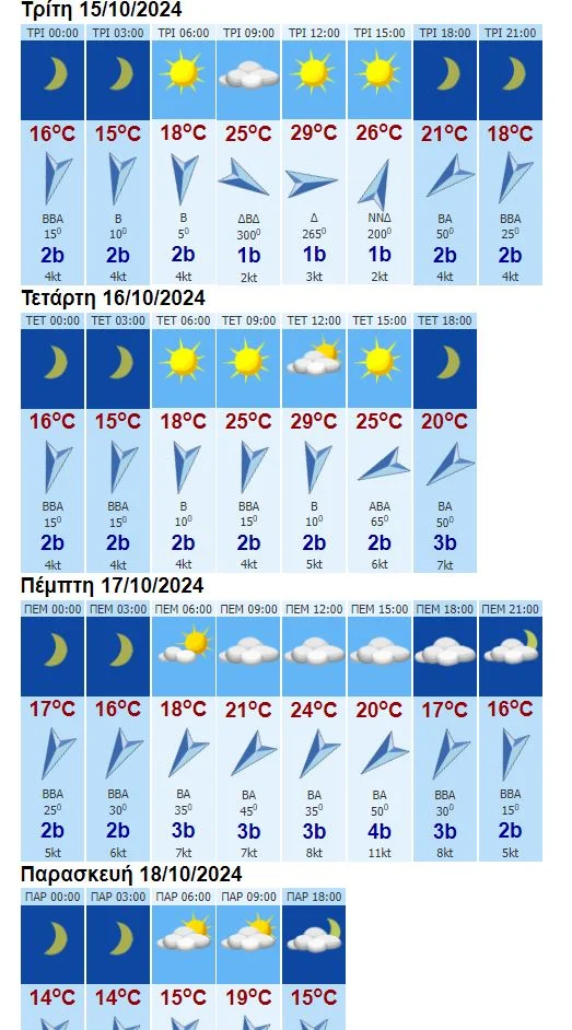 Οι άνεμοι θα ενισχυθούν από μέτριοι σε ισχυροί έως και τοπικά πολύ ισχυροί στο Αιγαίο, με τη θερμοκρασία να παρουσιάζει πτώση 6-8 βαθμών ως προς τις μέγιστες τιμές της.