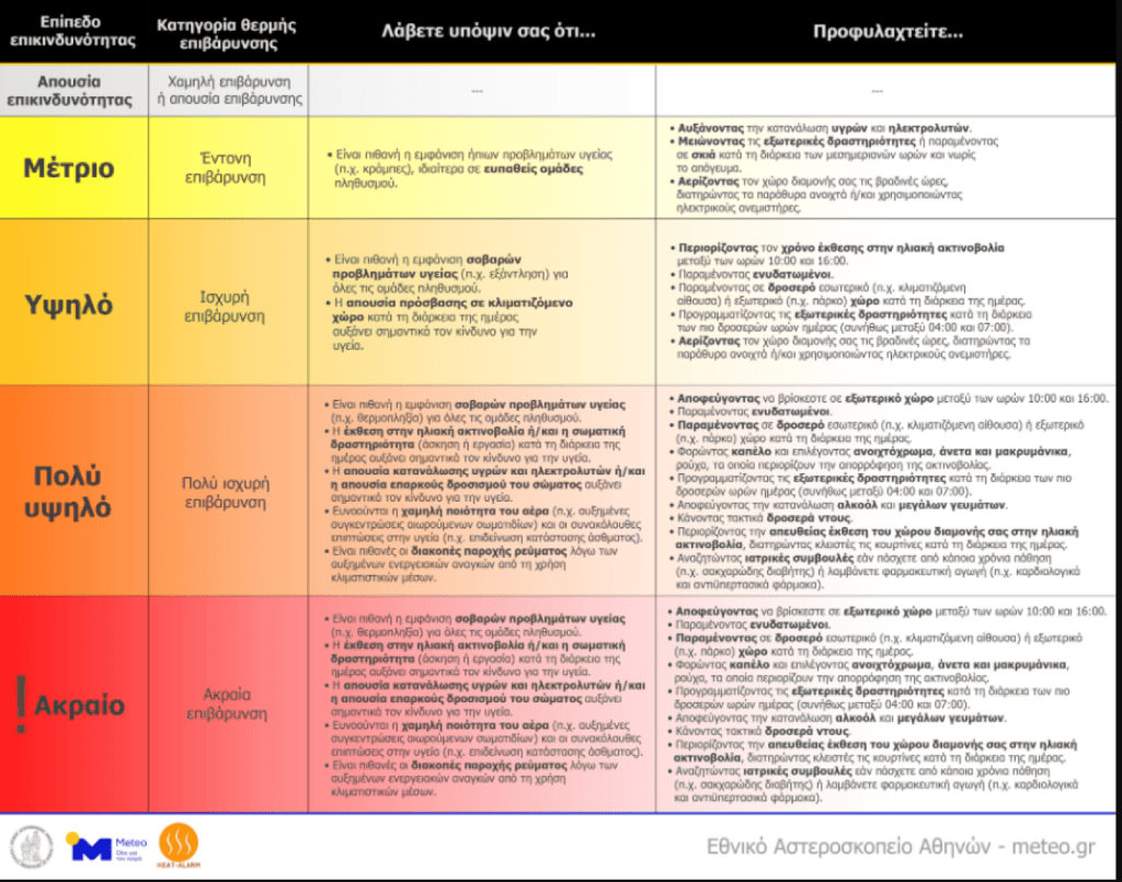 Πολύ υψηλές θερμοκρασίες, όπως αυτές που επηρεάζουν τη χώρα μας από τις αρχές της εβδομάδας, αποτελούν σημαντική απειλή για την ανθρώπινη υγεία λόγω της θερμής επιβάρυνσης που προκαλείται στον ανθρώπινο οργανισμό. Ο βαθμός και η επικινδυνότητα αυτής της επιβάρυνσης εξαρτάται, πέρα από την θερμοκρασία, από την υγρασία, τον άνεμο, και την ακτινοβολία περιβάλλοντος, αλλά και από προσωπικές παραμέτρους (φύλο, ηλικία, βάρος, ύψος, επίπεδο ένδυσης και σωματικής δραστηριότητας).