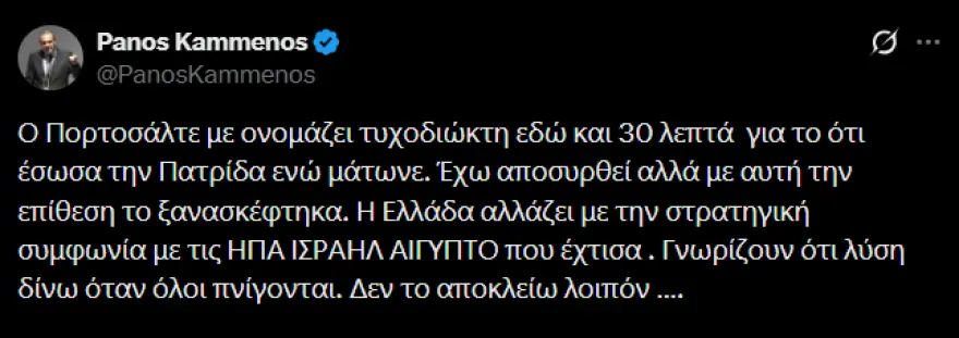 Ο Πορτοσάλτε με ονομάζει τυχοδιώκτη εδώ και 30 λεπτά για το ότι έσωσα την Πατρίδα ενώ μάτωνε. Έχω αποσυρθεί αλλά με αυτή την επίθεση το ξανασκέφτηκα. Η Ελλάδα αλλάζει με την στρατηγική συμφωνία με τις ΗΠΑ ΙΣΡΑΗΛ ΑΙΓΥΠΤΟ που έχτισα . Γνωρίζουν ότι λύση δίνω όταν όλοι πνίγονται. Δεν το αποκλείω λοιπόν ….