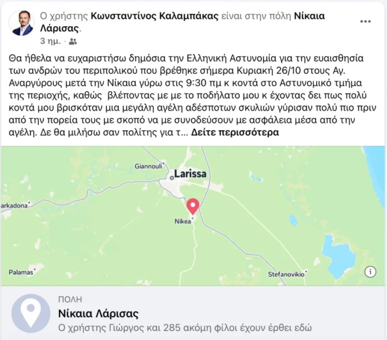 «Θα ήθελα να ευχαριστήσω δημόσια την Ελληνική Αστυνομία για την ευαισθησία των ανδρών του περιπολικού που βρέθηκε σήμερα Κυριακή 26/10 στους Αγ. Αναργύρους μετά την Νίκαια γύρω στις 9:30 πμ και κοντά στο Αστυνομικό τμήμα της περιοχής, καθώς βλέποντας με, με το ποδήλατο μου και έχοντας δει πως πολύ κοντά μου βρισκόταν μια μεγάλη αγέλη αδέσποτων σκυλιών γύρισαν πολύ πιο πριν από την πορεία τους με σκοπό να με συνοδεύσουν με ασφάλεια μέσα από την αγέλη. Δε θα μιλήσω σαν πολίτης για τη μάστιγα των αδέσποτων, τις ευθύνες που αναλογούν και αντί να μειώνονται μάλλον πολλαπλασιάζονται, ούτε για την αδιαφορία της κοινωνίας γενικότερα, αλλά για τον πραγματικά μεγάλο κίνδυνο ενηλίκων και κυρίως παιδιών από τις αγέλες αυτές. Πολύ πιο επικίνδυνα κ λυπηρά τα πράγματα δηλαδή.
