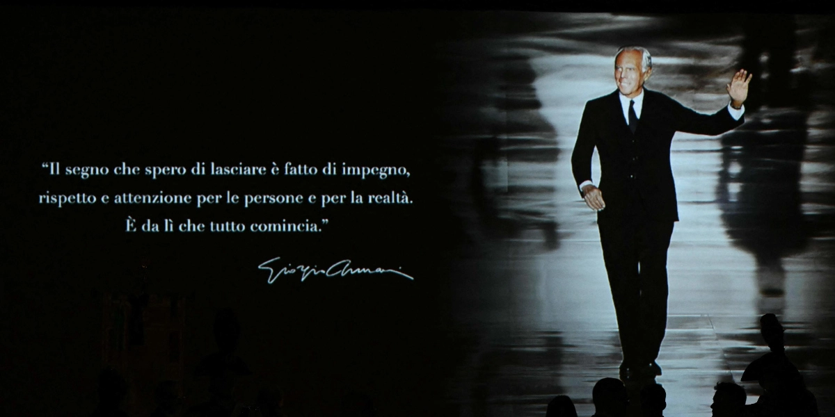 «Ελπίζω να αφήσω μια ανάμνηση διαρκούς προσπάθειας, σεβασμού και προσεκτικής προσέγγισης των ανθρώπων και της πραγματικότητας. Όλα ξεκινούν από εκεί», είναι η φράση του Τζόρτζιο Αρμάνι η οποία προβάλλεται σε γιγαντοοθόνη στο εσωτερικό του θεάτρου, όπου πραγματοποιείται το λαϊκό προσκύνημα. Ο χώρος έχει διακοσμηθεί με λευκά λουλούδια.