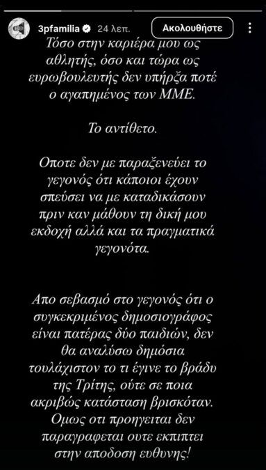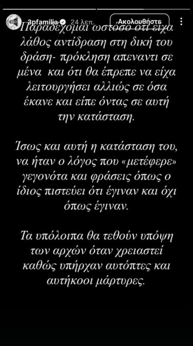 Με ανάρτησή του στο instagram, ο ίδιος σημειώνει επίσης ότι κάποιοι έχουν σπεύσει «να με καταδικάσουν πριν καν μάθουν τη δική μου εκδοχή, αλλά και τα πραγματικά γεγονότα».