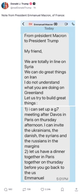 Ο πρόεδρος των ΗΠΑ, Ντόναλντ Τραμπ, ανήρτησε το βράδυ της Δευτέρας στο Truth Social ένα γραπτό μήνυμα που είχε λάβει από τον Γάλλο πρόεδρο Εμανουέλ Μακρόν.