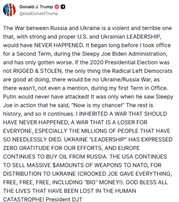 Αναλυτικά η ανάρτηση του Τραμπ: Ο πόλεμος μεταξύ Ρωσίας και Ουκρανίας είναι ένας βίαιος και τρομερός πόλεμος που, με την ισχυρή και σωστή ΗΓΕΣΙΑ των ΗΠΑ και της Ουκρανίας, ΔΕΝ ΘΑ ΕΙΧΕ ΣΥΜΒΕΙ ΠΟΤΕ. Ξεκίνησε πολύ πριν αναλάβω τη δεύτερη θητεία μου, κατά τη διάρκεια της κυβέρνησης του κοιμισμένου Μπάιντεν, και έχει μόνο επιδεινωθεί. Αν οι προεδρικές εκλογές του 2020 δεν είχαν νοθευτεί και κλαπεί, το μόνο πράγμα στο οποίο είναι καλοί οι ριζοσπάστες αριστεροί δημοκράτες, δεν θα υπήρχε πόλεμος μεταξύ Ουκρανίας και Ρωσίας, όπως δεν υπήρχε, ούτε καν αναφορά, κατά τη διάρκεια της πρώτης θητείας μου.