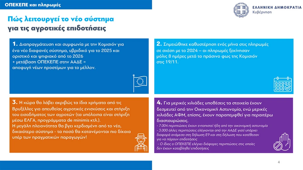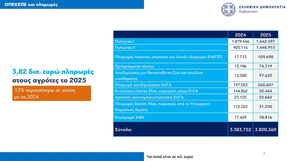 Παράλληλα, αναγνώρισε ότι υπήρξε καθυστέρηση περίπου ενός μήνα στις πληρωμές σε σύγκριση με το 2024, οι οποίες ξεκίνησαν φέτος στα τέλη Νοεμβρίου, έπειτα από σχετική αλληλογραφία με την Ευρωπαϊκή Επιτροπή. Διευκρίνισε, ωστόσο, ότι τα κονδύλια που λαμβάνει η χώρα από την ΕΕ για τις άμεσες ενισχύσεις παραμένουν αμετάβλητα. «Οι πραγματικοί παραγωγοί θα είναι αυτοί που τελικά θα ωφεληθούν, καθώς τα ίδια χρήματα θα κατανέμονται με πιο δίκαιο τρόπο», ανέφερε χαρακτηριστικά.
