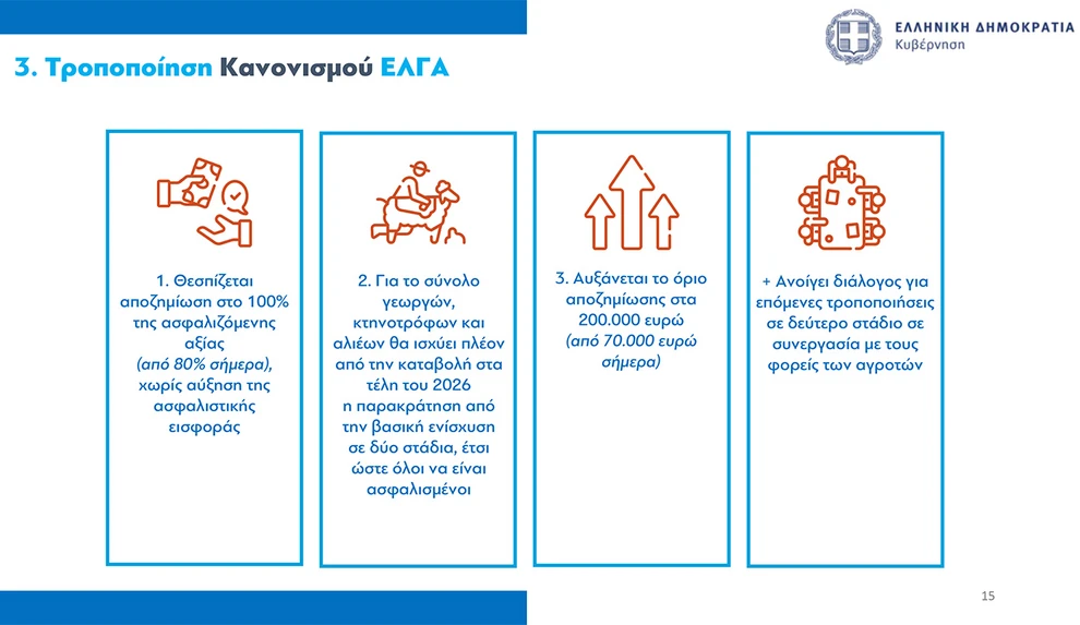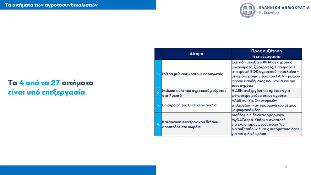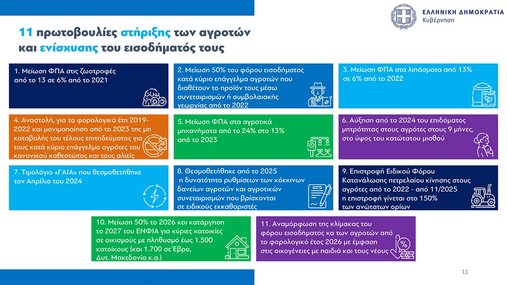 Ακολούθως, παρουσίασε τις 11 πρωτοβουλίες στήριξης του αγροτικού εισοδήματος, που περιλαμβάνουν μεταξύ άλλων μειώσεις ΦΠΑ σε ζωοτροφές και λιπάσματα, φορολογικές ελαφρύνσεις και την κατάργηση του τέλους επιτηδεύματος για κατά κύριο επάγγελμα αγρότες.