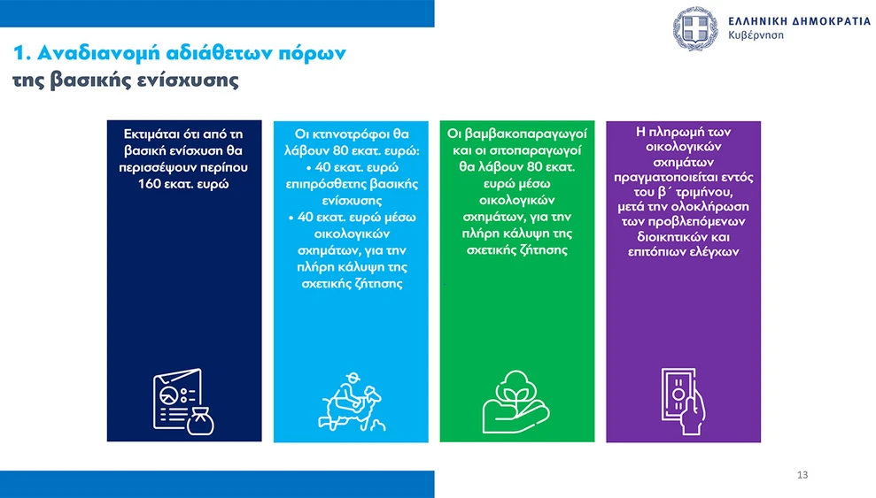 Αναφερόμενος στο νέο σύστημα αγροτικών επιδοτήσεων, ο κ. Χατζηδάκης παρουσίασε αναλυτικά τον πίνακα πληρωμών και επεσήμανε τη σημασία της διαφάνειας. Όπως είπε, μετά την ολοκλήρωση των ελέγχων του πρώτου πυλώνα της ΚΑΠ, εκτιμάται ότι θα παραμείνουν αδιάθετα 160 εκατ. ευρώ, εκ των οποίων 80 εκατ. ευρώ θα κατευθυνθούν στους κτηνοτρόφους και άλλα 80 εκατ. σε βαμβακοπαραγωγούς και σιτηροπαραγωγούς.