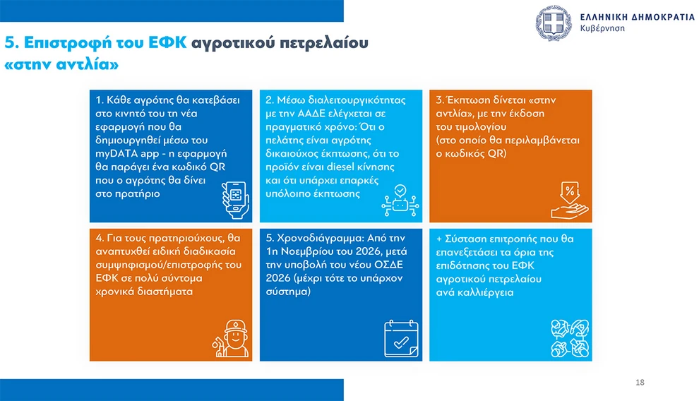 Για την επιστροφή του ΕΦΚ στο αγροτικό πετρέλαιο, ο υφυπουργός Οικονομικών Θάνος Πετραλιάς εξήγησε ότι θα γίνεται απευθείας στην αντλία, μέσω ειδικής εφαρμογής στο κινητό, με χρήση QR code και διασύνδεση με την ΑΑΔΕ. Το νέο σύστημα αναμένεται να τεθεί σε εφαρμογή από την 1η Νοεμβρίου 2026.