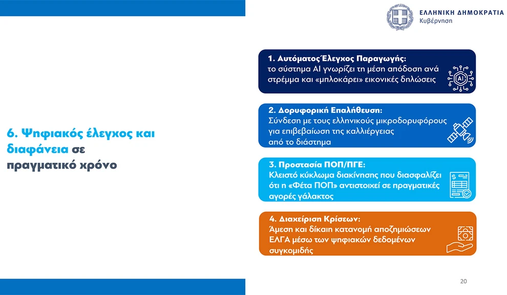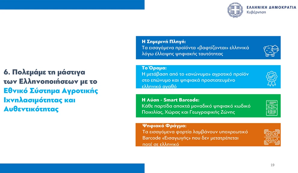 Τέλος, ο υπουργός Ψηφιακής Διακυβέρνησης Δημήτρης Παπαστεργίου παρουσίασε την εφαρμογή Agro-Verify, η οποία θα επιτρέπει την πλήρη ιχνηλάτηση των ελληνικών προϊόντων, από το χωράφι έως το ράφι, με στόχο τη διαφάνεια και την προστασία της ελληνικής παραγωγής.
