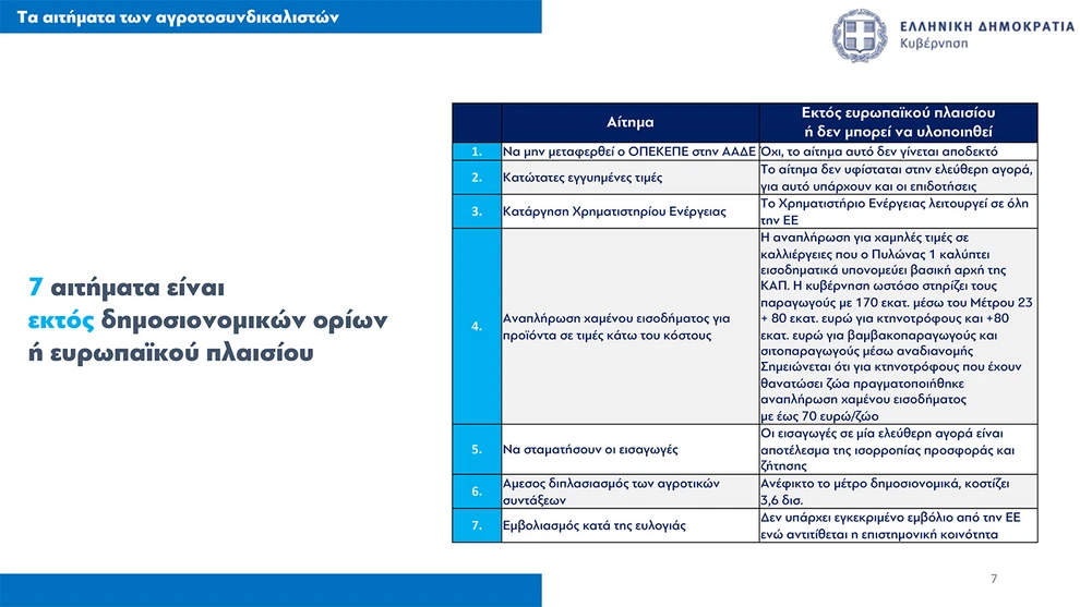 Επανέλαβε ότι τα περισσότερα από τα αιτήματα των αγροτών έχουν ήδη αντιμετωπιστεί, ενώ ειδική αναφορά έκανε και στη στήριξη των κτηνοτρόφων, τόσο για τη θανάτωση ζώων όσο και για την απώλεια εισοδήματος σε βάθος ενός έτους.